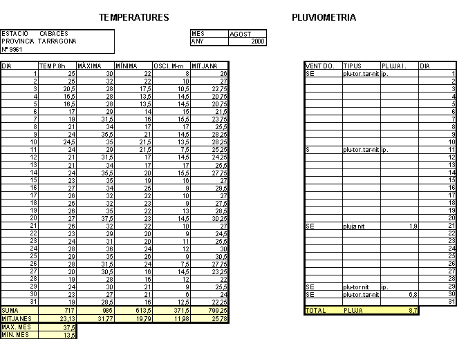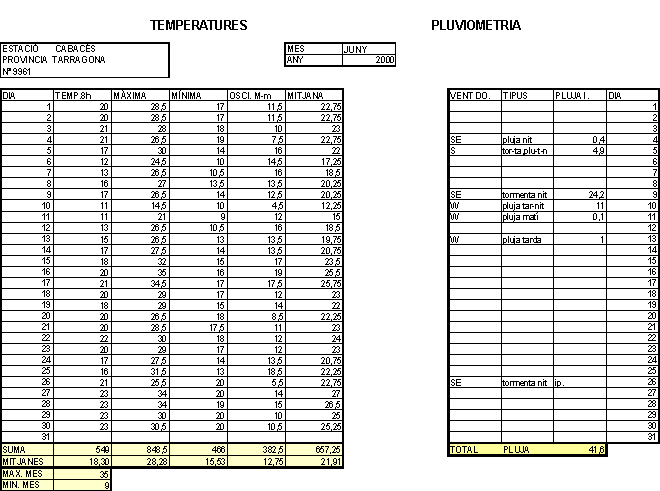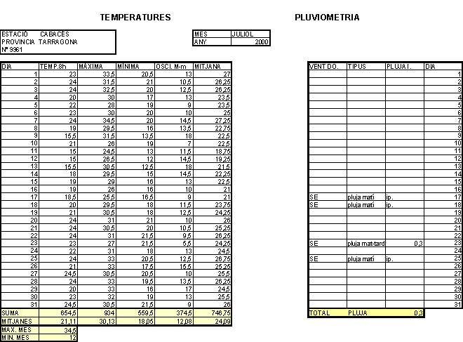 Completa informació meteorològica dels mesos de juny, juliol i agost del 2000, amb temperatures i pluviometria. A més, en aquest apartat també hi trobareu la interessantíssima secció d’efemèrides meteorològiques.